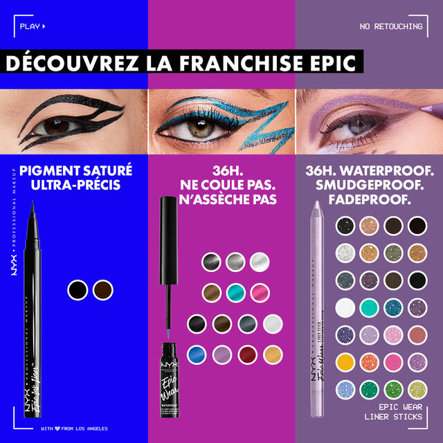 Lidstriche werden jetzt wahrhaft EPISCH mit NYX Professional Makeup Epic Wear Liner Sticks! Diese hochpigmentierten Eyeliner-Stifte sind in Nuancen mit mattem und metallischem Finish erhältlich und bieten 36-stündigen wasser- und wischfesten Halt ohne Verblassen. Mit diesen wirkungsvollen Eyeliner-Stiften, die jede Vorstellung von gewagter Farbe mit langem Halt bei Weitem übertreffen, erzielst du hinreißende grafische Eyeliner-Looks.