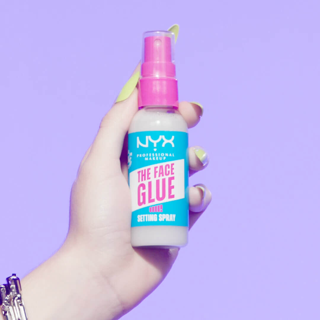 2. Das NYX Professional Makeup The Face Glue Extreme Hold Makeup Setting Spray schütteln, öffnen und aus etwa 18 bis 20 cm Entfernung auf das Gesicht aufsprühen.